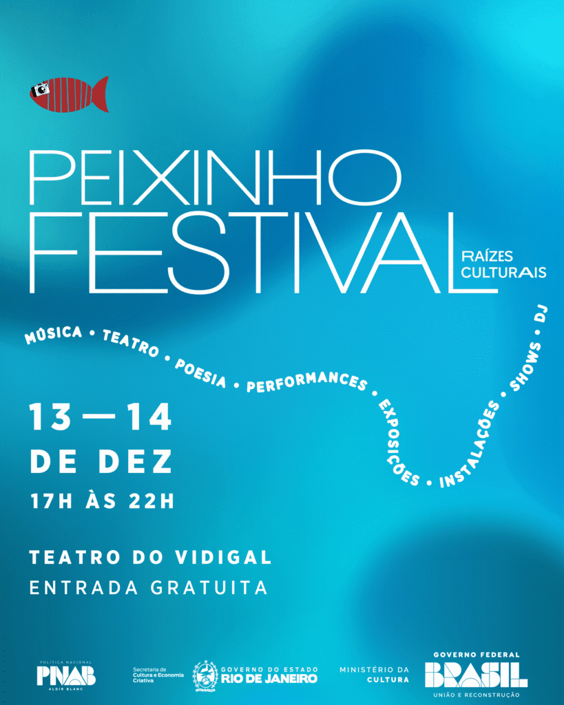 Um espaço de encontro, criação e celebração da arte brasileira. Esse é o propósito do Peixinho Festival, que estreia no Teatro do Vidigal, no Morro do Vidigal, nos dias 13 e 14 de dezembro, sábado e domingo, das 17h às 22h. Com uma programação diversificada inspirada em raízes culturais, o evento receberá 18 artistas em apresentações musicais, teatro, poesia, performances, exposições e instalações. A entrada é gratuita.