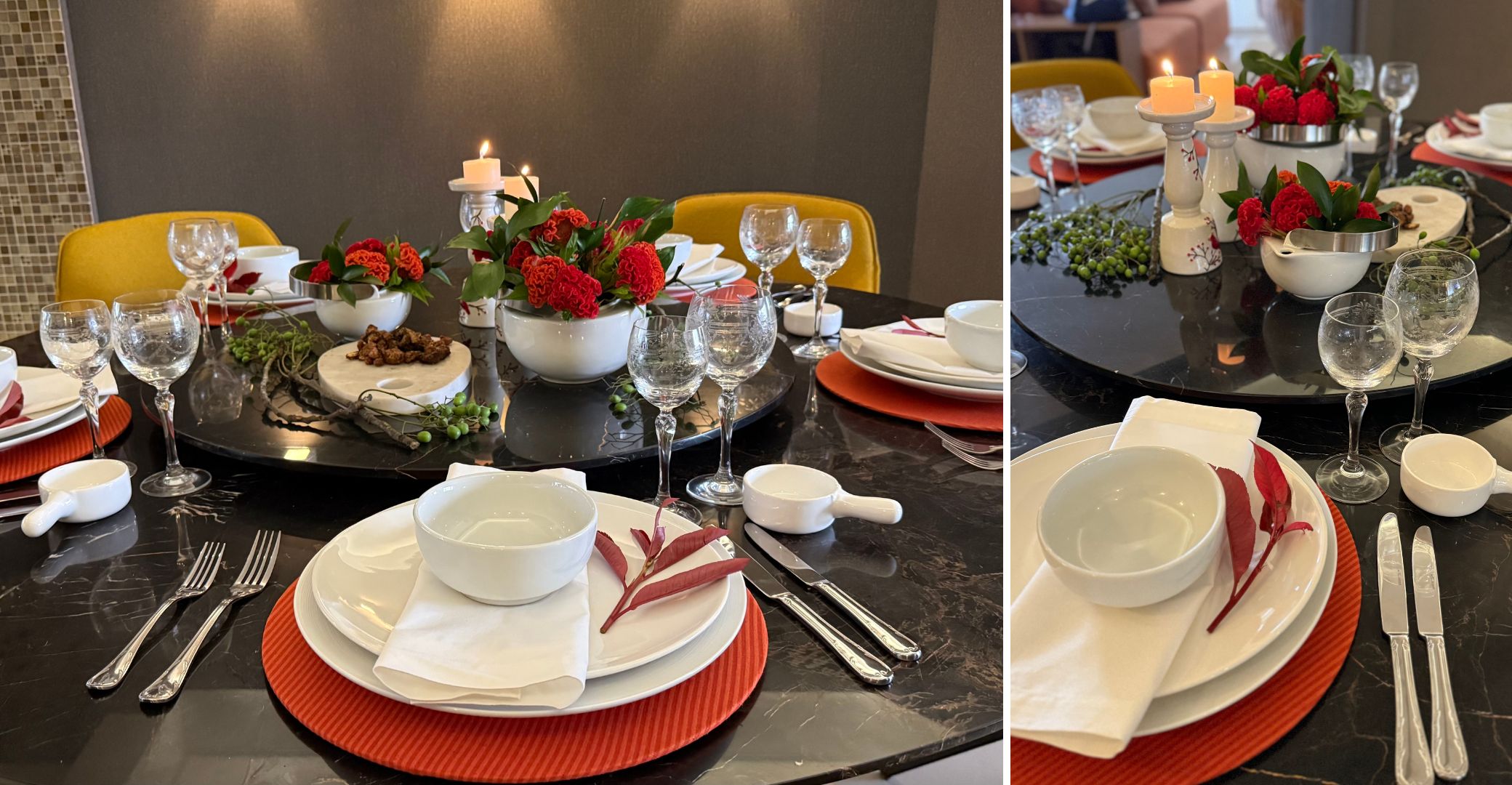 “Vale começar pelo essencial como a aplicação de jogo americano vermelho, sousplat branco associado com louças da mesma cor e guardanapo claro para manter a harmonia”, diz Cristiane.