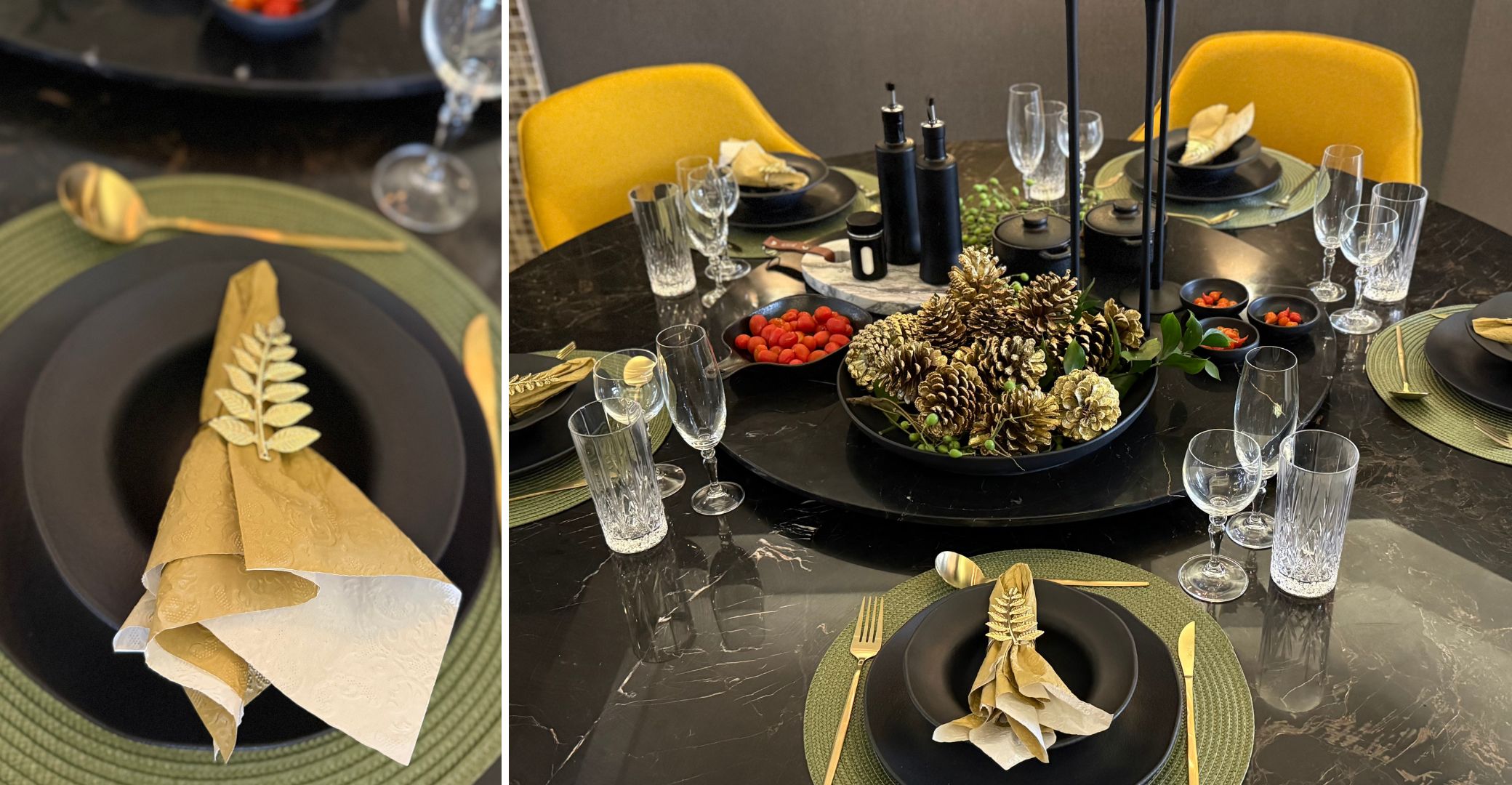 Mesa posta com louças pretas e detalhes dourados