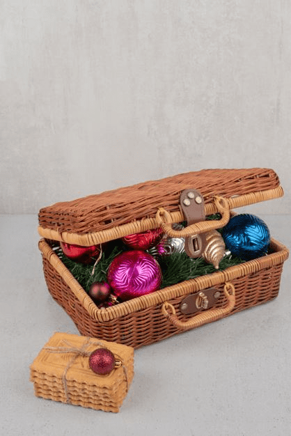 · Por fim, a árvore de Natal precisa ser desmontada para reduzir o volume; as luzes enroladas em um pedaço de papelão como base e a guirlanda, por sua delicadeza merece uma caixa própria.