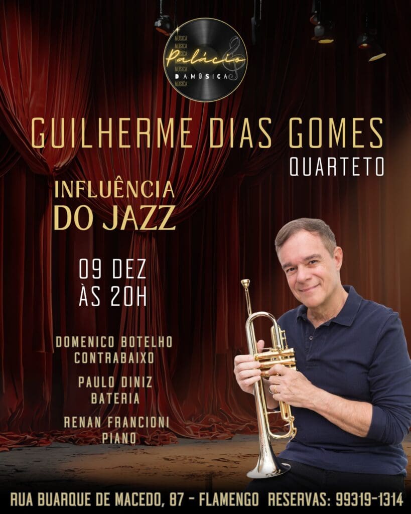 Guilherme Dias Gomes Quarteto apresenta “Influências do Jazz”, show comandado por um dos mais talentosos trompetistas, compositores e arranjadores da música instrumental brasileira contemporânea. A apresentação acontece no Palácio da Música, no Flamengo, no dia 09 de dezembro, terça-feira, às 20h.