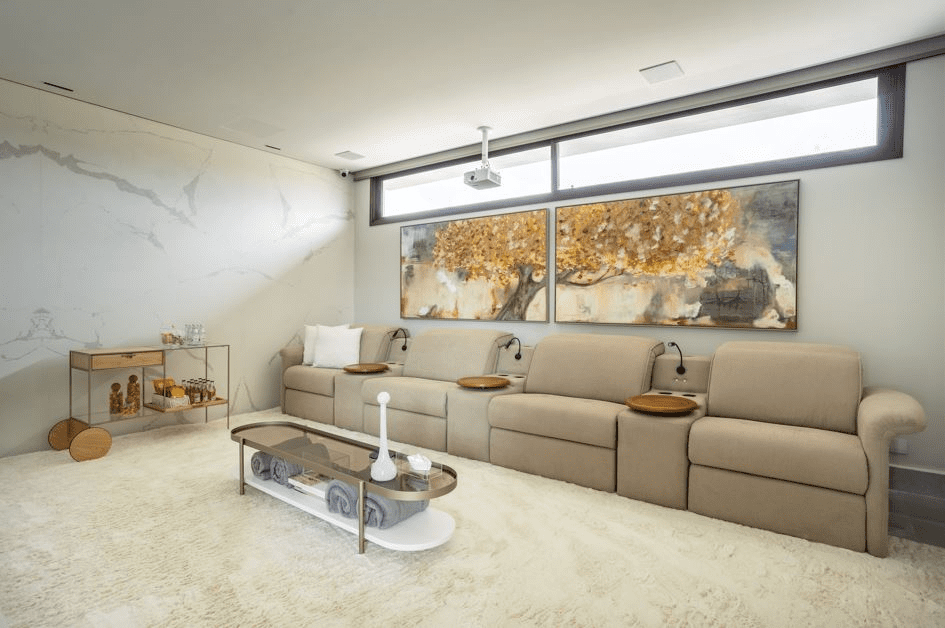 O espaço possui um mobiliário acolhedor, iluminação indireta e o uso de texturas para conceber um ambiente propício para a sétima arte | Projeto Meneghisso & Pasquotto Arquitetura | Foto: JP Image