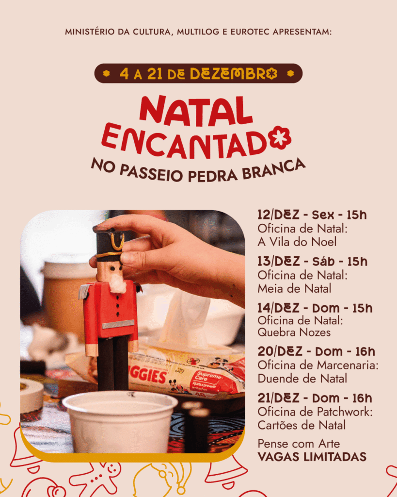 Na sexta-feira (19), o teatro musical “Grinch e o desaparecimento das cartas de Natal”, da companhia Espaço2, retorna ao palco, trazendo uma narrativa lúdica que dialoga com o imaginário infantil e com o espírito natalino. Já no sábado (20), além da Feira de Artesanatos Pedra Branca, o público poderá participar da oficina de marcenaria “Duende de Natal”, atividade que une criatividade, aprendizado e diversão para diferentes idades.