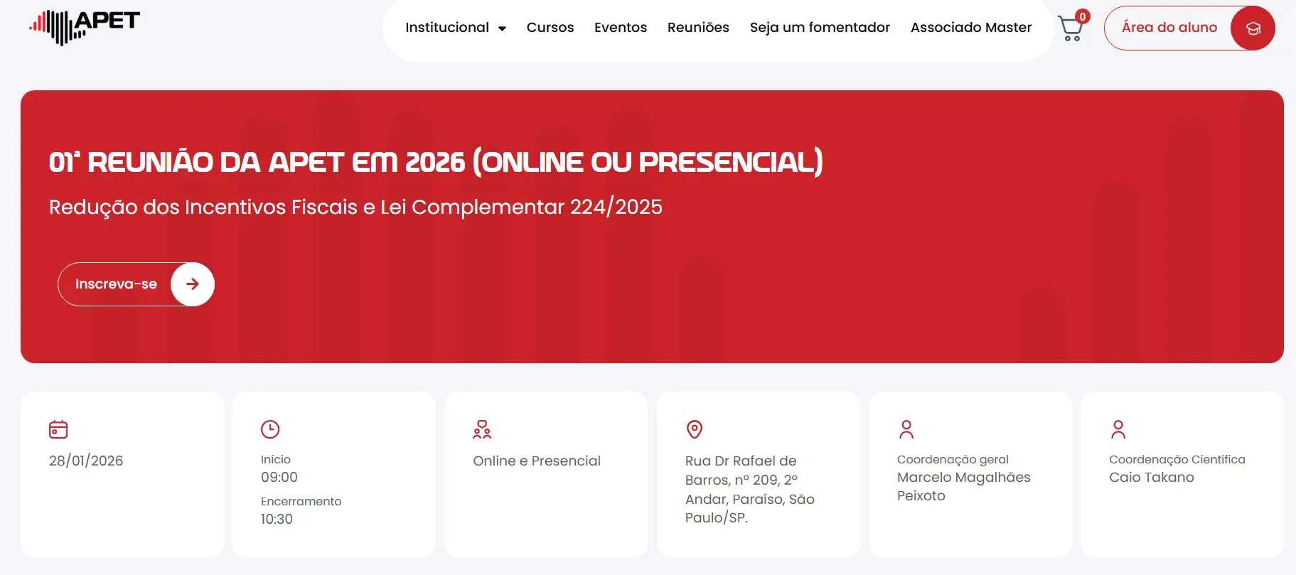 A Associação Paulista de Estudos Tributários convidou quatro especialistas para analisarem a redução de incentivos fiscais estabelecida pela Lei Complementar nº 224/2025 (LC 224/2025), publicada no final de 2025, na quarta, 28/01, 9h, na sede da instituição na Rua Dr. Rafael de Barros, nº 209, Paraíso, São Paulo/SP. O evento é híbrido. Presencialmente, todos serão recepcionados num welcome coffee. On-line, as palestras podem ser assistidas no canal de YouTube da associação ou via zoom.