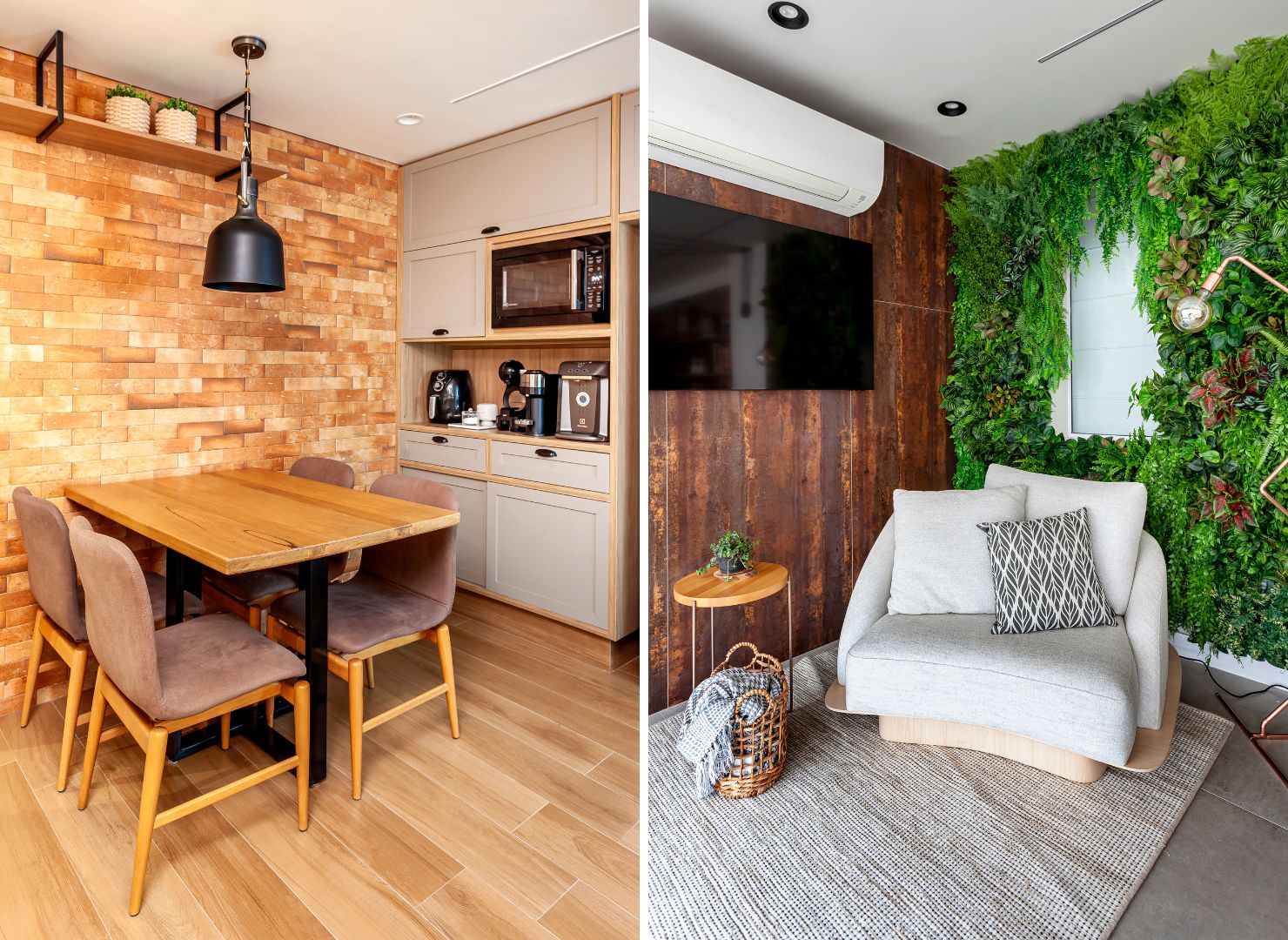 O lado mais ‘rústico’ do projeto se fez presente com a parede de tijolinhos na cozinha, além docantinho da varanda com o aspecto natural do tapete, o jardim vertical com plantas preservadas e orevestimento da parede que se assemelha ao aspecto do aço corten | Projeto Cristiane SchiavoniArquitetura | Foto: Carlos Piratininga