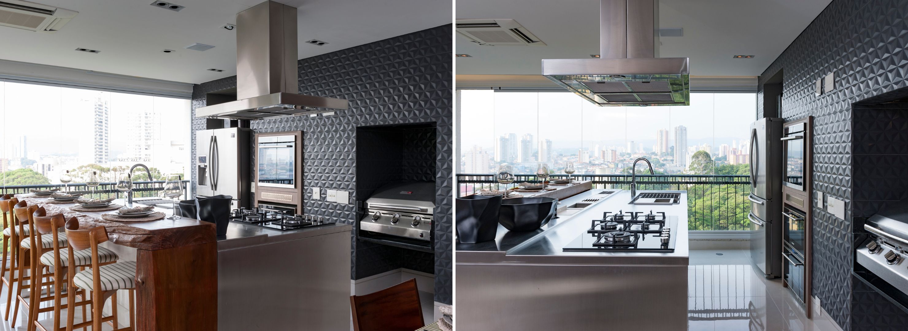 Para atender os dois lados, a profissional estabeleceu uma solução híbrida: a ilha enaltece o inox que reveste a bancada de trabalho e o aparador de madeira maciça tornou-se o espaço para as refeições rápidas. O viés moderno é prontamente percebido pelos eletros, a churrasqueira e o revestimento 3D aplicado em toda área gourmet.