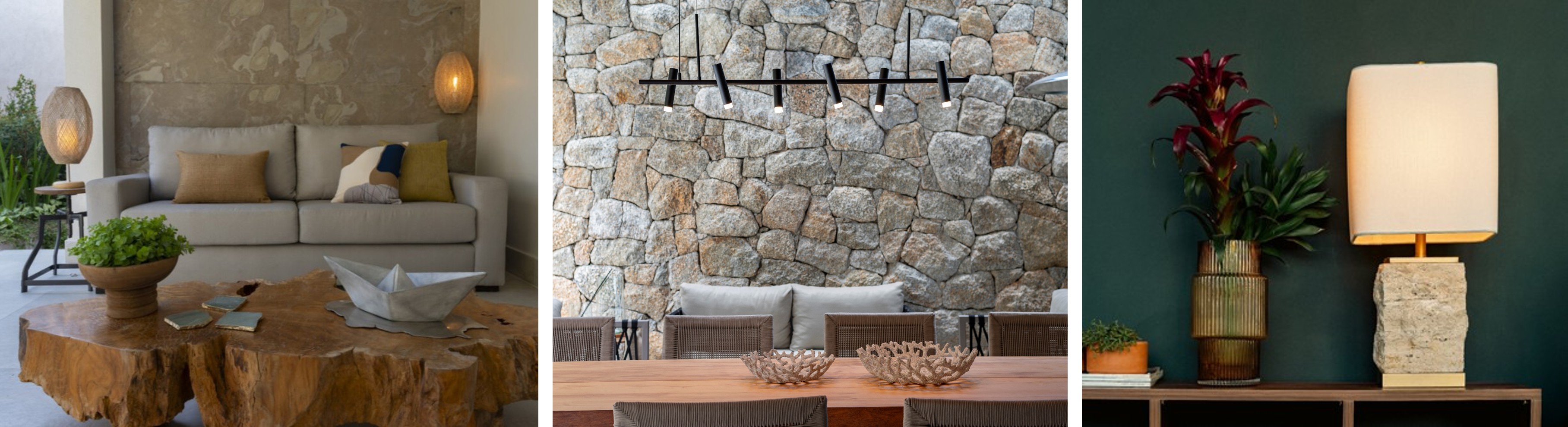 | Madeira e pedra em estado bruto em diferentes contextos | Foto 1 – projeto da arquiteta Gisele Bizzo; foto 2 – projeto de Moana Arquitetura, ambas com créditos de Emerson Rodrigues. Foto 3 – divulgação Yamamura Collection |
