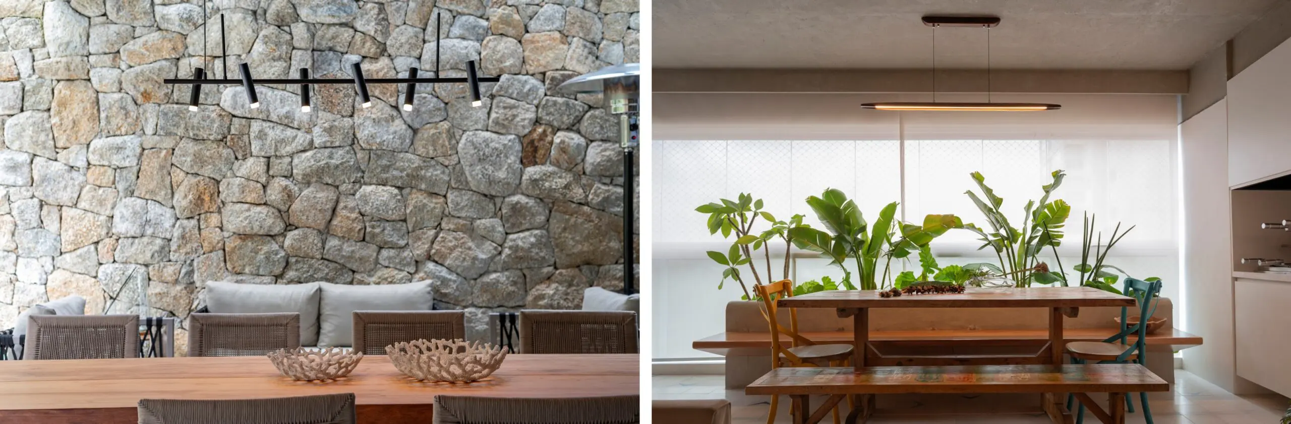 | Madeira e pedra em estado bruto em diferentes contextos | Foto 1 – projeto da arquiteta Gisele Bizzo; foto 2 – projeto de Moana Arquitetura, ambas com créditos de Emerson Rodrigues. Foto 3 – divulgação Yamamura Collection |