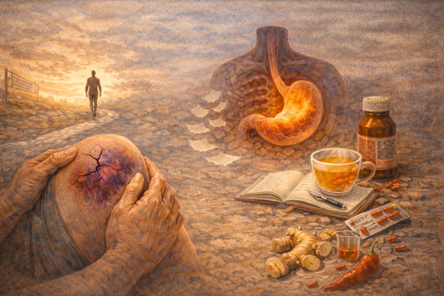 Iniciei o que estava ao meu alcance: compressas de gelo, spray de massagem e, logo depois, um anti-inflamatório. Um comprimido vermelho a cada oito horas. O joelho reagiu; o estômago, não. Vieram os efeitos colaterais da automedicação: dores abdominais, refluxo, náusea, prisão de ventre. De repente, já não era apenas o joelho. Eu estava de cama.