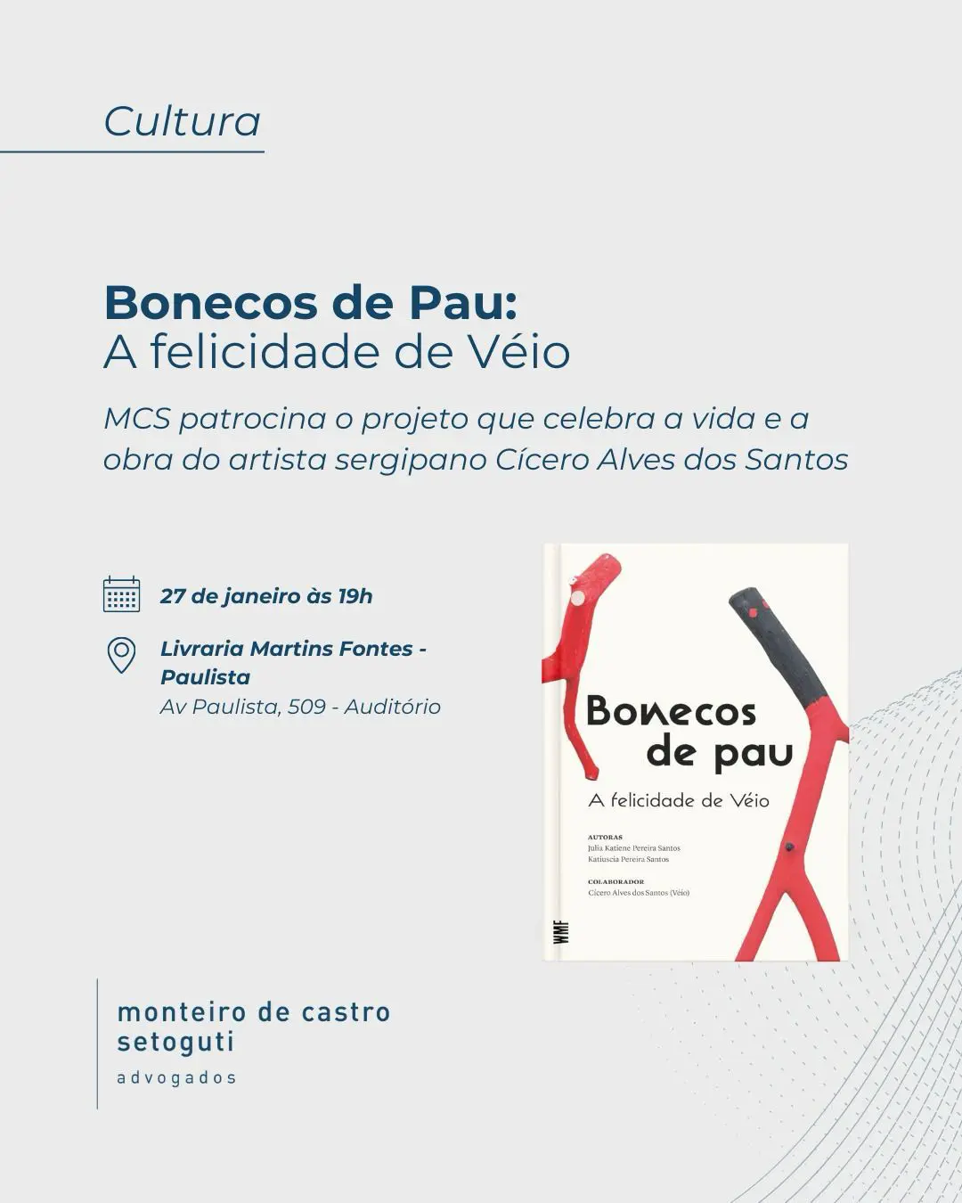 As filhas do artista sergipano Cícero Alves dos Santos, o Véio, lançam no próximo dia 27, na Livraria Martins Fontes da Paulista, o livro “Bonecos de pau: a felicidade de Véio”. Escrita por Julia Katiene e Katiuscia Pereira Santos, a obra é uma biografia romanceada que mistura as memórias reais da família com o universo das esculturas do artista. O projeto, que celebra a trajetória e os valores sociais do escultor de Feira Nova, conta com o patrocínio da MCS.