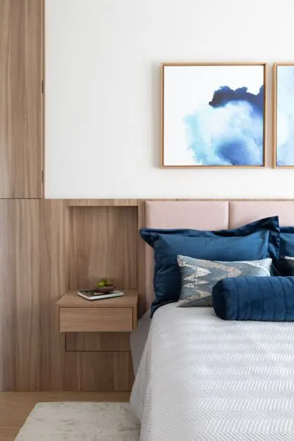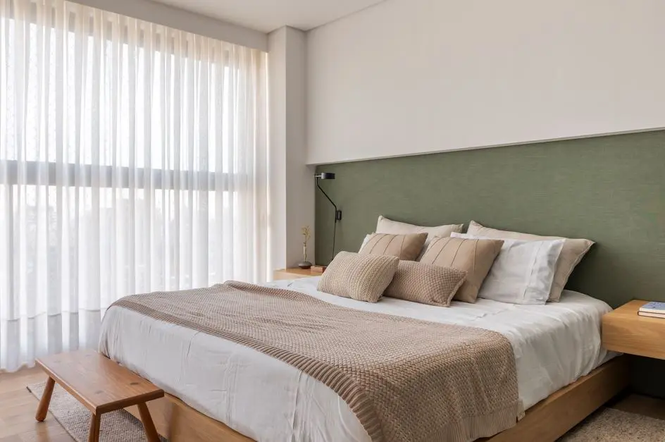 Além do colchão, a cabeceira e o enxoval complementam a sensação de aconchego. Para ele, as cabeceiras trazem presença e conforto acústico, enquanto versões de madeira ripada ou painéis contínuos ajudam a criar unidade visual.