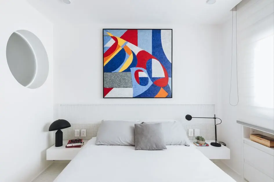 A suíte desse apartamento é composta por tons claros com a intenção de destacar a obra de arte em cima da cabeceira em serralheria, que não encosta no piso e sobrepõe o granilite da cabeceira | Projeto Rawi Arquitetura + Design | Foto: Juliana Deeke