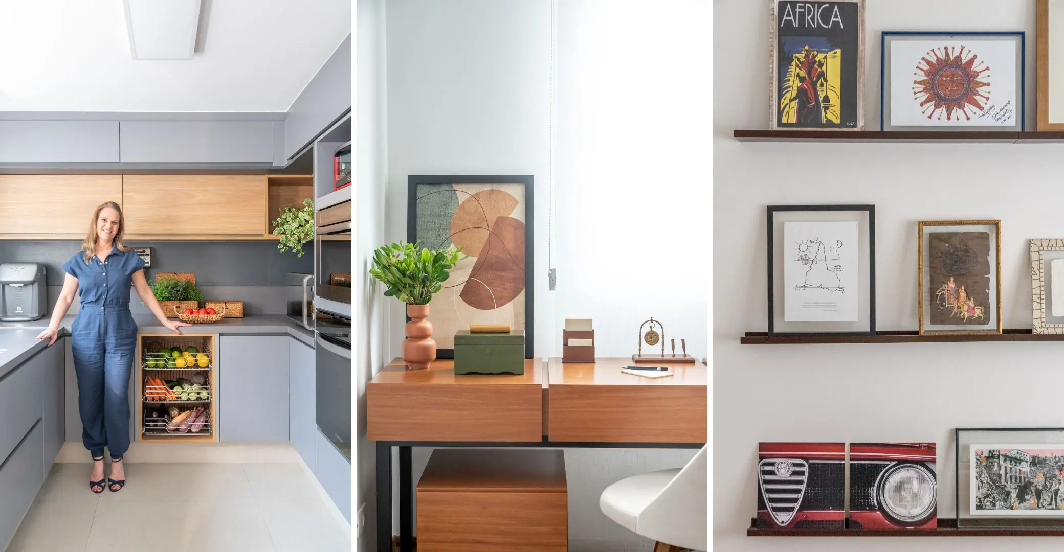 “Elas andaram um pouco sumidas do layout das cozinhas, o que também é justificado pela diminuição dos espaços. Sempre que possível, gosto de trazê-las dentro da marcenaria, pois além do colorido dos alimentos, seu posicionamento também facilita as atividades de preparo“, analisa Isabella