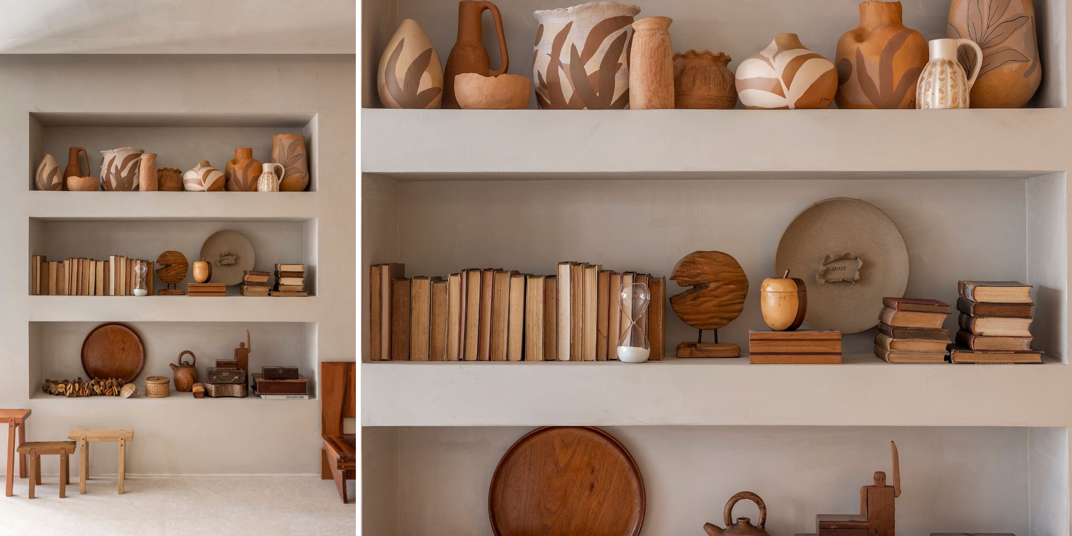 Dentro dos nichos que compõem a estante, peças cerâmicas feitas por mulheres doJequitinhonha (MG) | Projeto Isabella Nalon | Fotos: Rafael Renzo