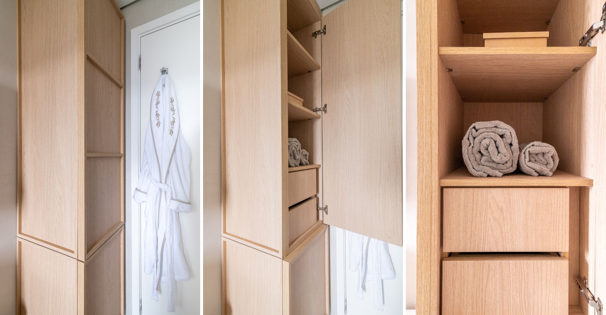 Quem já não passou pela situação de colocar a toalha para lavar e esquecer de pegar uma peça limpa antes de ligar o chuveiro? “Muitas das vezes os itens de cama e banho estão alocados no armário do dormitório, fazendo desse descuido um grande transtorno“, avalia a arquiteta.