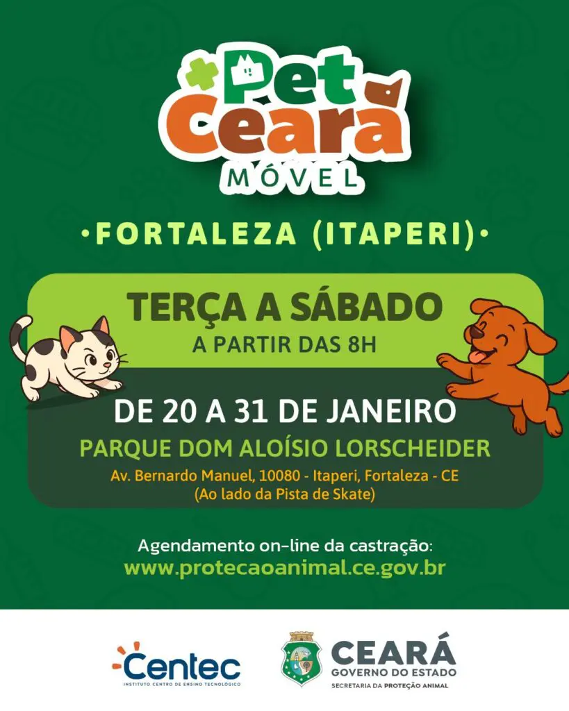O Pet Ceará Móvel, programa do Governo do Ceará, por meio da Secretaria da Proteção Animal (Sepa), está em Fortaleza, no bairro Itaperi, oferecendo castração gratuita de cães e cadelas entre os dias 20 e 31 de janeiro, no Parque Dom Aloísio Lorscheider. Os atendimentos ocorrem de terça a sábado, a partir das 8h, mediante agendamento on-line.