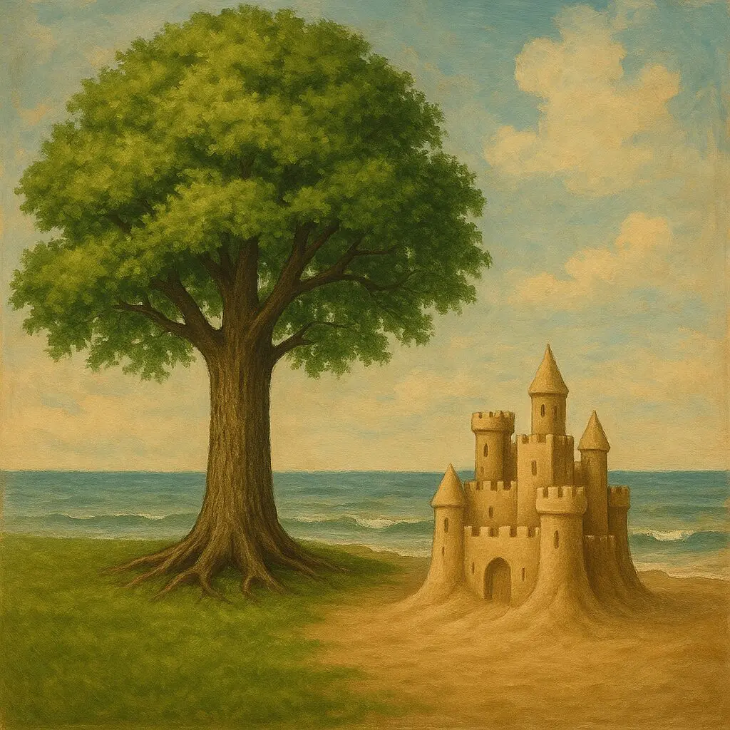 Estamos na era de provar, provar o que temos. O que somos? Ficou para depois. Mas o importante mesmo é ressaltar o que possuímos; isso, sim, estufa o peito do mais insignificante ser humano, que se sente grande demais ao lado de quem aparenta pouco e cresce devagar. Confesso que isso me assusta, não vou mentir; às vezes também me perco, mesmo sabendo que meus valores são outros. Todavia, prefiro acreditar que mais vale crescer devagar como uma árvore que, em terra fértil, é regada todos os dias, sofre as mudanças climáticas, demora anos para crescer, porém, quando grande, se torna forte, cria raízes e ainda dá frutos, do que ser um castelo de areia, construído com pressa à beira-mar, que impressiona à primeira vista, ergue-se rápido, atrai olhares, mas pode desabar com a primeira onda. Ainda assim, o castelo de areia é o que mais será reconhecido, pois, em sua rapidez e forma, todos puderam acompanhar sua construção, enquanto a árvore está no seu canto, devagar, mas se transformando a cada dia, vivendo no bastidor, enquanto o palco do castelo está armado.
