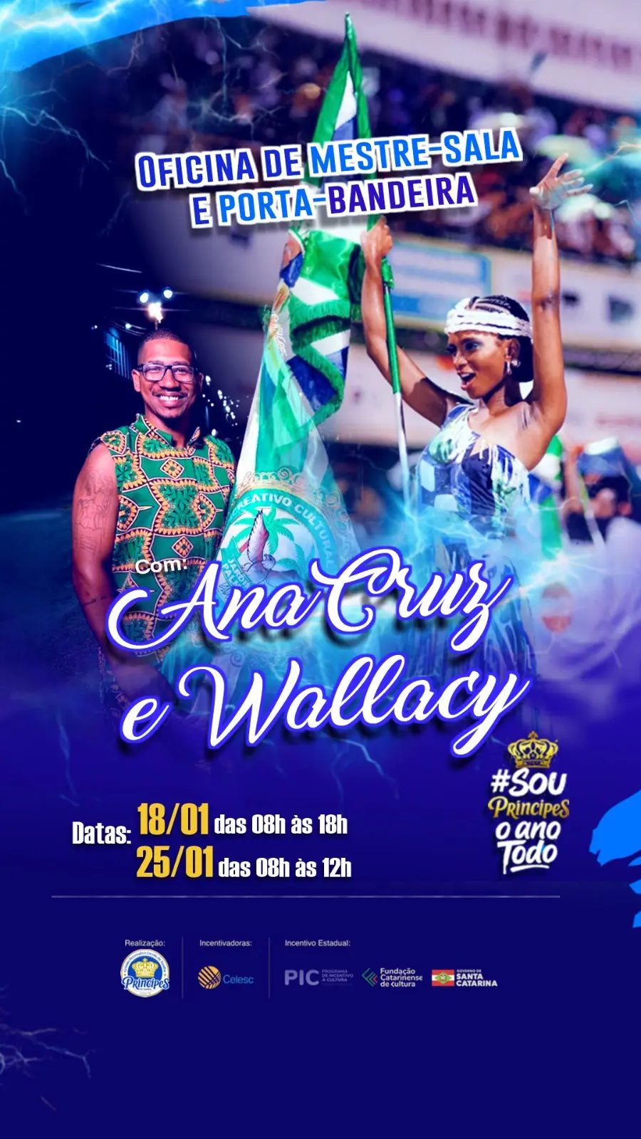 Através do Programa de Incentivo à Cultura, o PIC, com patrocínio da Celesc, acontece nos dias 18 e 25 de janeiro, dois domingos consecutivos, das 8h às 18h e das 8h às 12h, na Sociedade Kênia Clube, em Joinville, a oficina gratuita de Mestre-sala e Porta bandeira, ministrada pelo mestre Wallacy Nascimento e por Ana Carolina Cruz, ambos de Florianópolis. Mestre-sala e porta-bandeira são o casal central e mais tradicional das escolas de samba, responsáveis por conduzir e defender o pavilhão (a bandeira) da agremiação com uma dança elegante, coreografias complexas e trajes que representam o enredo, sendo guardiões do símbolo máximo da escola.