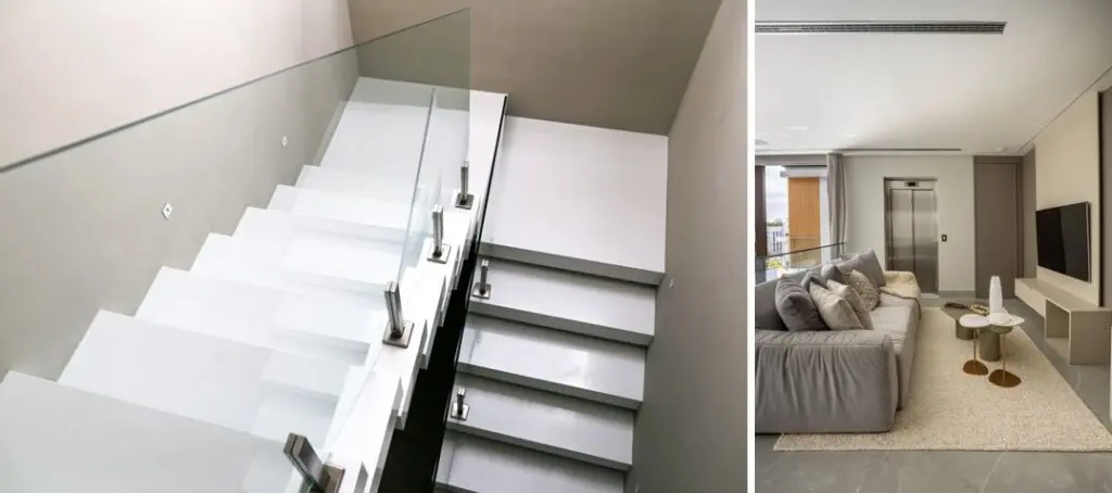 Uma realidade de quem possui residências em terrenos inclinados é a presença vital de escadas e elevadores residenciais | Projetos Meneghisso & Pasquotto Arquitetura | Foto: Divulgação e JP Image