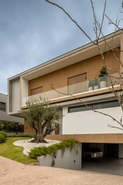 As garagens costumam ser um dos maiores desafios no desenho da fachada e, no terrenos padrões, vagas para três ou quatro carros podem ocupar grande parte da fachada e comprometer a leitura arquitetônica do projeto.
