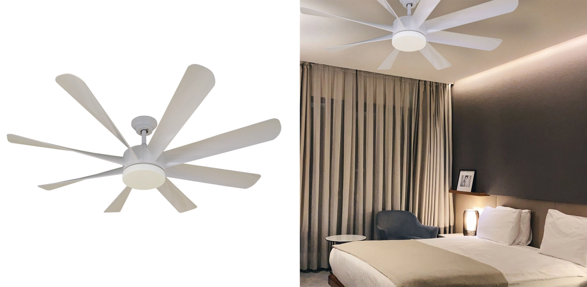 Ventilador com LED integrado, oito pás, potência de 23W e fluxo luminoso de 2000lm. Produzido em termoplástico e metal com acabamento em pintura nas cores gelo e cinza. Possui temperatura de cor ajustável de 2700K (luz amarela), 4000K (luz neutra) e 6500K (luz branca). Tensão: 127/220. Acompanha controle remoto. Dimensões (Alt. x Diam.): 38cm x 152cm. Marca Aliseu. Valor: R$ 4.336.