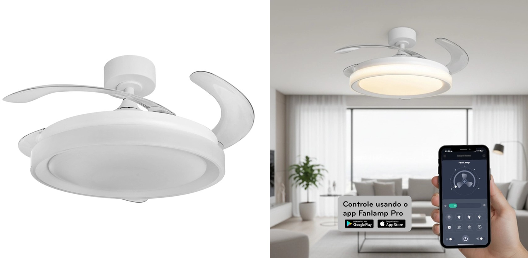 Ventilador de teto com LED integrado, potência de 96W e fluxo luminoso de 5000lm. É ultrasilencioso e possui temporizador. É produzido em alumínio e polietileno, com acabamento na cor branca, pás retráteis e luz disponível em três temperaturas de cor: 3000K (branco quente), 4000K (branco neutro) e 6000K (branco frio). É possível controlar pelo controle ou aplicativo via Bluetooth. Dimensões (Alt. x Diam.): 49cm x 115cm. Disponível nas tensões 127V e 220V. Marca: Tualux. Valor: R$ 929.