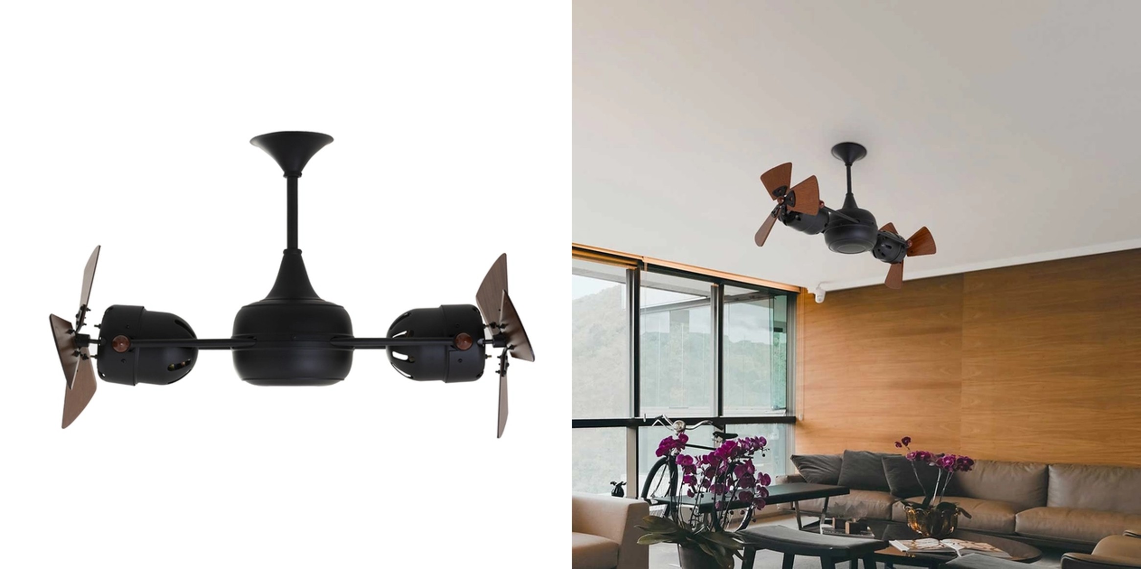 Ventilador de teto mini duplo. É produzido em aço e madeira com acabamento em pintura na cor preta fosca. Acompanha controle de parede tipo dimmer. Rotação máxima de cada motor: 1150 RPM. Tensão: 127V. Dimensões (Alt. x Diam. x Larg.): 51cm x 80cm x 30cm. (Sem iluminação). Marca: Gerbar. Valor: R$ 5.522.