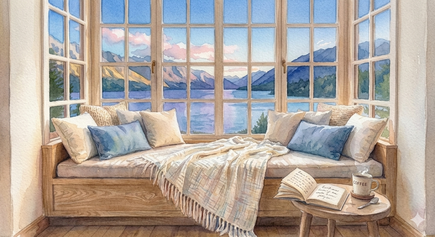 Hoje, cansada, no fim do dia, olhava imagens rolando a tela do celular. Coleciono coisas que me interessam, que acho bonitas, que me fazem rir ou que possam ter alguma serventia. Entre elas, acompanho páginas de arquitetura. E me apareceu uma fotografia daquelas de casas que talvez só existam em fotografias mesmo ou pertençam a pessoas que eu ainda não conheci. Casa num lugar de clima ameno, daqueles que a gente ama quando o sol quente entra todinho pela casa. Uma sala ampla, janelas imensas de vidro com montantes, travessas e aquele banco largo embutido na base que tem sempre um assento forrado, muitas almofadas e uma mantinha de algodão cru. Uma vista lindíssima para o lago. Parede branca e madeira clara. Vez por outra uma porta azul que a gente tem certeza que na loja de tinta não vende daquele tom. Ao lado do banco uma mesinha, um café que se sabe quente pela leve fumacinha que sobrevoa a xícara e um livro aberto. E, claro, a deliciosa luz amarela que entra radiosa pela janela como um manto de paz e tranquilidade.