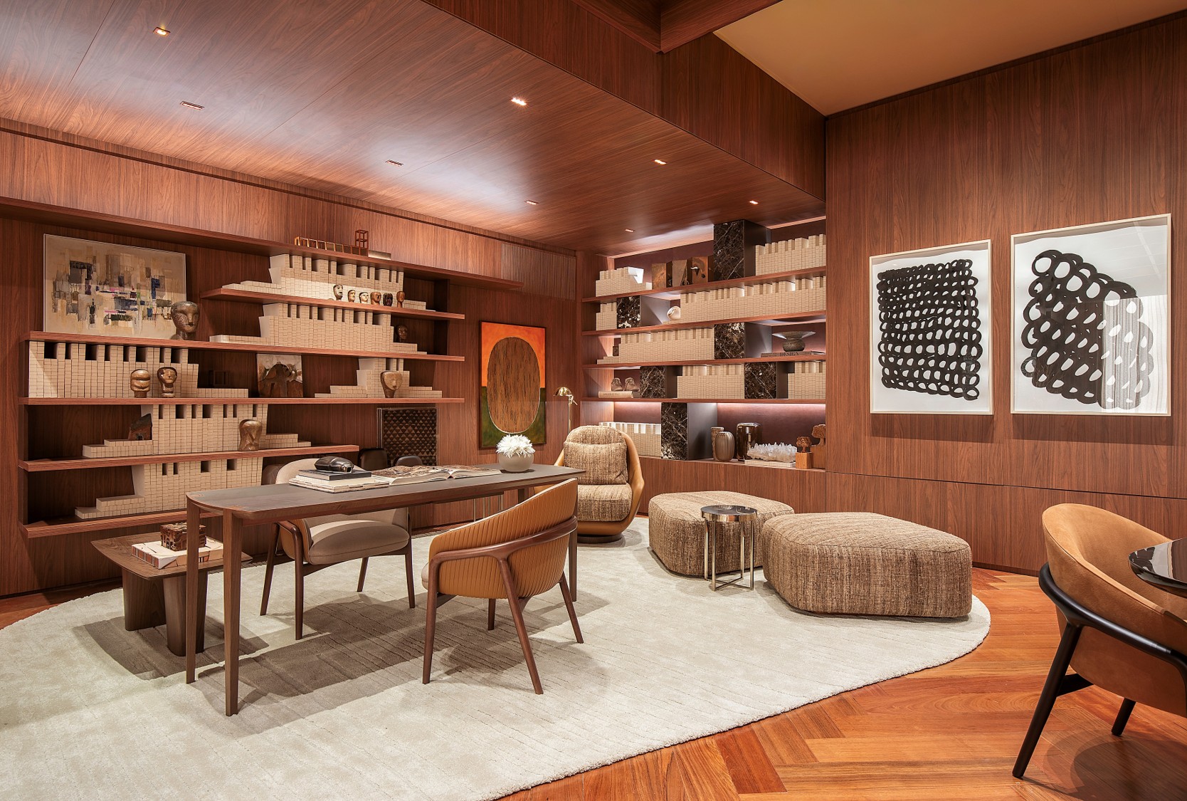 | Nem toda obra precisa ser protagonista. Essa escolha faz parte da estratégia da curadoria. “Às vezes uma obra nasce com o intuito de ser um destaque do projeto, ou às vezes ela é algo mais silencioso”, explica. Quando a intenção é evidenciar a peça, recursos como iluminação e posicionamento entram em cena. De acordo com a arquiteta, obras de nomes consagrados, por exemplo, podem assumir o protagonismo e chamar atenção, exigindo um tratamento específico para a valorização. Escala, proporção e harmonia |