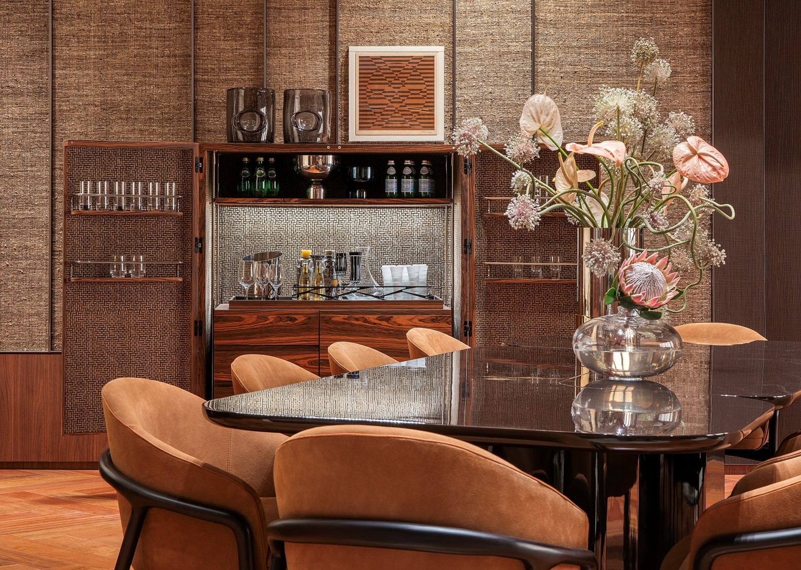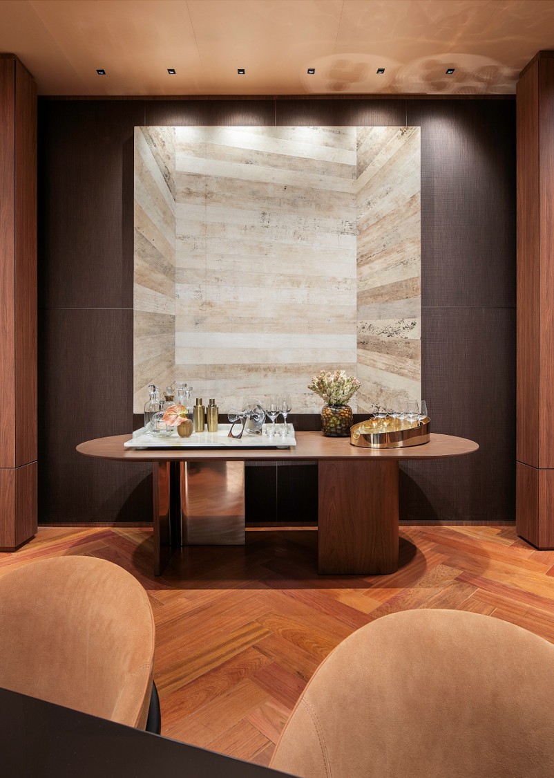 | Como fundo para a sala de jantar do projeto da arquiteta Denise Barretto para a Mostra Artefacto 2026, a obra sem título do arquiteto e artista Maurício Nogueira Lima (1930-1999) reflete o movimento artístico concretista. No projeto, o quadro surge como um complemento silencioso | Foto: Raphael Briest |