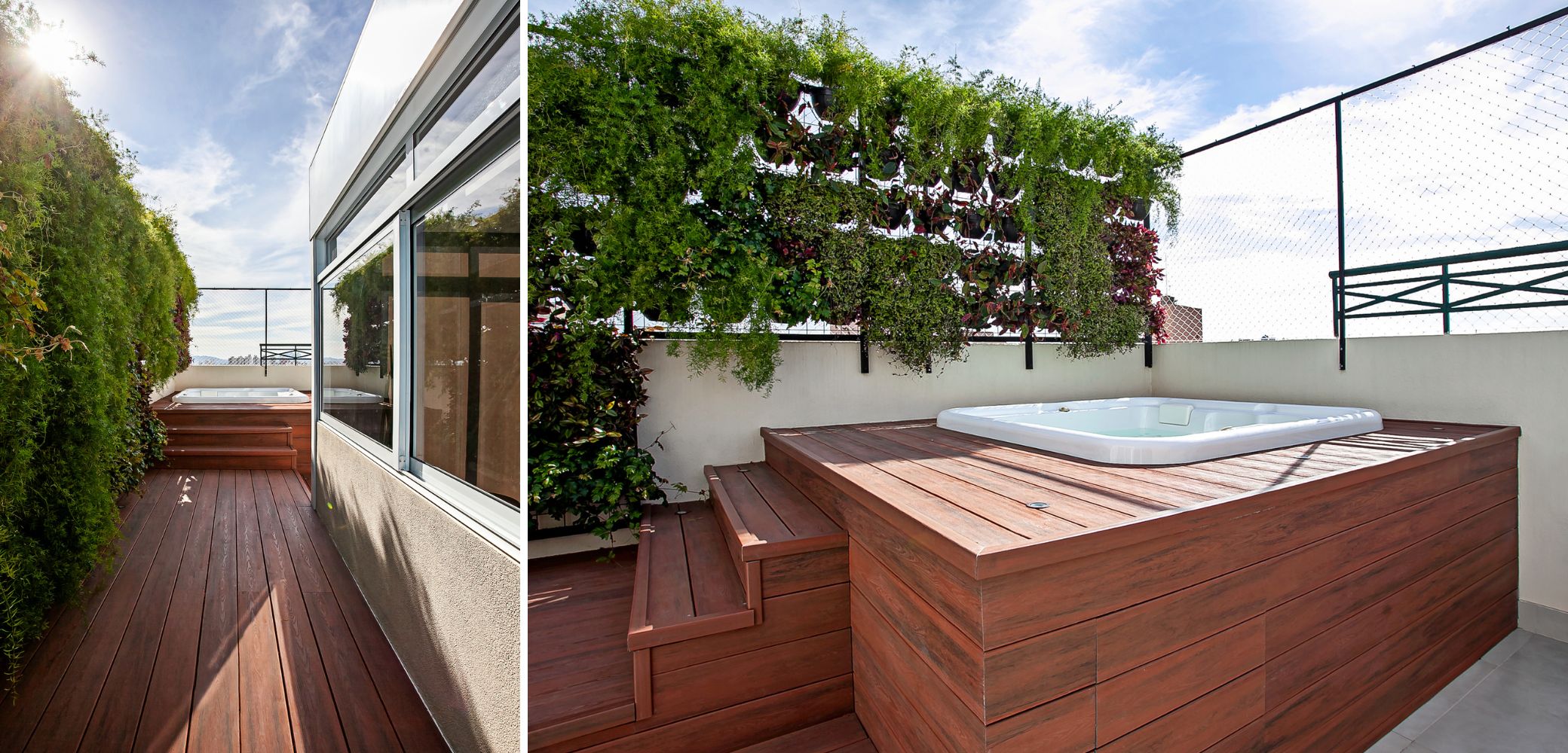 Na cobertura de um apartamento, a arquiteta Cristiane Schiavoni elegeu a madeira ecológica paraproduzir a área de lazer com a banheira de hidromassagem | Foto: Carlos Piratininga