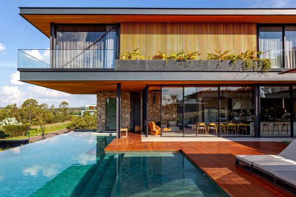 Nessa residência com projeto de interiores assinado pela arquiteta Cristiane Schiavoni, o deck de madeira acompanha o formato da piscina aquecida e com borda infinita. Ademais, a estrutura se conecta com a arquitetura da casa com os amplos forros e os detalhes presentes na fachada. Em um condomínio situado na cidade de Itu, interior de São Paulo, seu estilo campestre e sofisticado é completado pelo paisagismo que circunda o entorno | Fotos: Carlos Piratininga