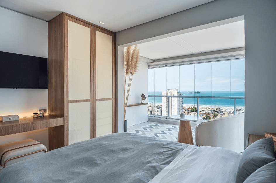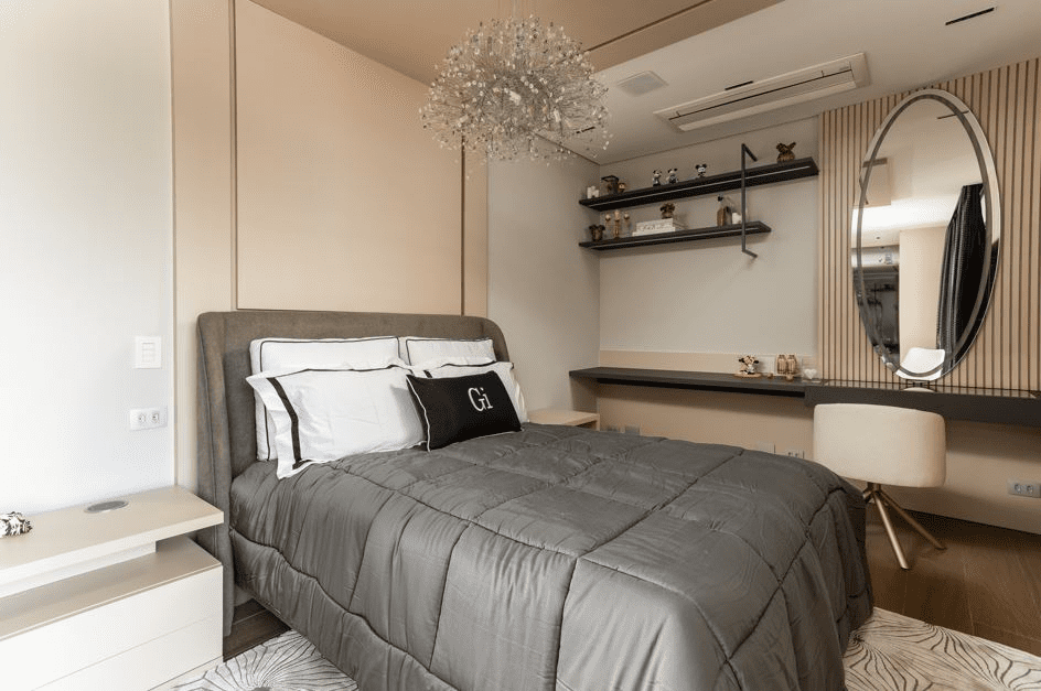 – Quarto: para o descanso, o emprego de uma paleta neutra que acolhe, cortinas de tecidos leves que filtram a luz natural e uma cama bem composta com enxoval em algodão de alta qualidade compõem a proposta. O mobiliário acompanha a referência de linhas suaves, cabeceiras estofadas e mesas de apoio discretas.